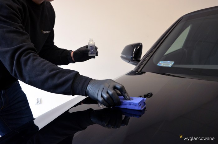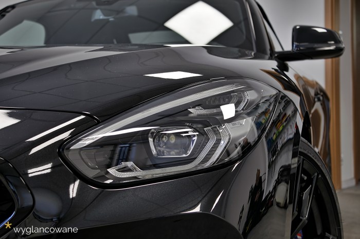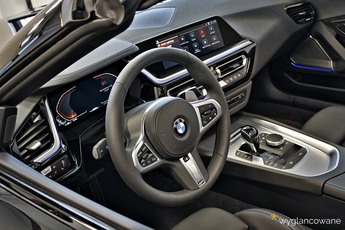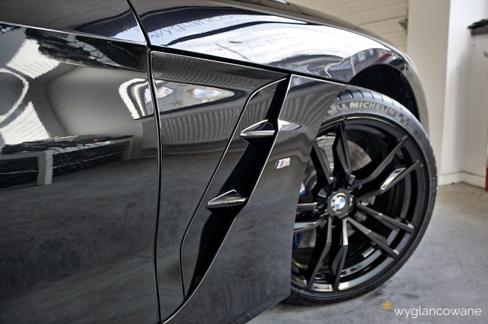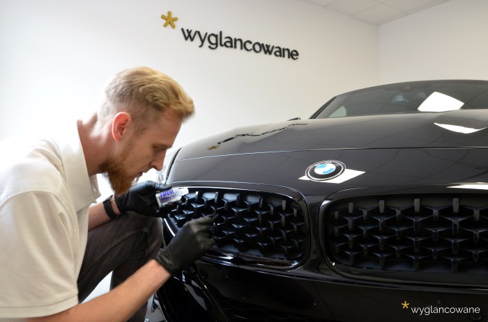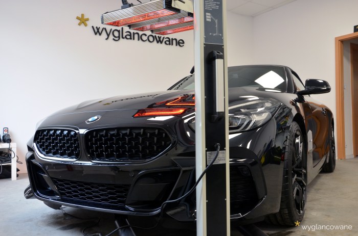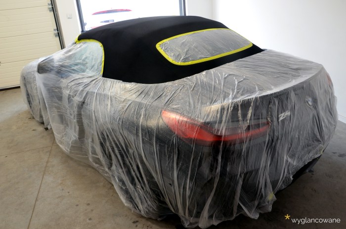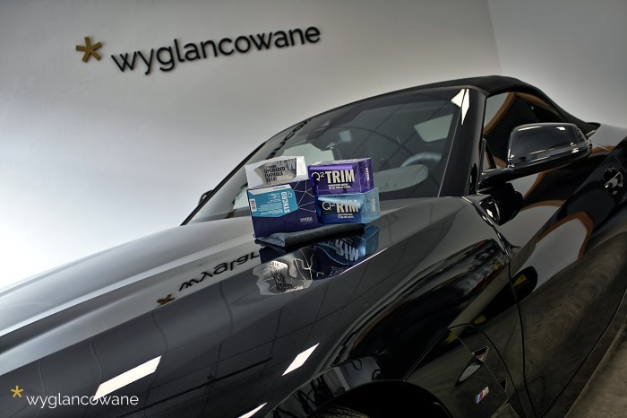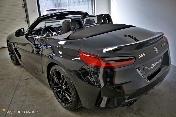 Czarne BMW Z4 to samochód, który trafił do nas niemalże wprost z salonu, z symbolicznym przebiegiem. Naszym zadaniem było jego kompleksowe zabezpieczenie zestawem powłok ochronnych Gyeon. Tak więc kolejno, na wszystkie elementy pojazdu trafiły powłoki: lakier – powłoka ceramiczna Gyeon Syncro; felgi – Gyeon Rim; tworzywa sztuczne – Gyeon Trim; materiałowy dach – Gyeon Fabric Coat; szyby – dedykowana powłoka. Oczywiście nie obyło się bez odpowiedniego przygotowania wszystkich tych powierzchni, z delikatną korektą lakieru włącznie. Tak „wyglancowana” zet czwórka robi naprawdę duże wrażenie.