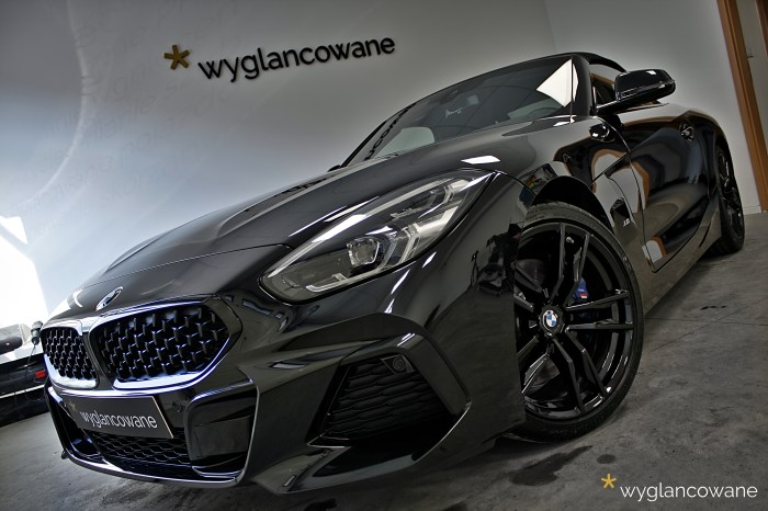 Czarne BMW Z4 to samochód, który trafił do nas niemalże wprost z salonu, z symbolicznym przebiegiem. Naszym zadaniem było jego kompleksowe zabezpieczenie zestawem powłok ochronnych Gyeon. Tak więc kolejno, na wszystkie elementy pojazdu trafiły powłoki: lakier – powłoka ceramiczna Gyeon Syncro; felgi – Gyeon Rim; tworzywa sztuczne – Gyeon Trim; materiałowy dach – Gyeon Fabric Coat; szyby – dedykowana powłoka. Oczywiście nie obyło się bez odpowiedniego przygotowania wszystkich tych powierzchni, z delikatną korektą lakieru włącznie. Tak „wyglancowana” zet czwórka robi naprawdę duże wrażenie.